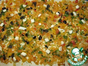 Выложить обжаренные овощи, посыпать зеленью и маслинами. Добавить сливочное масло, нарезанное на кусочки.