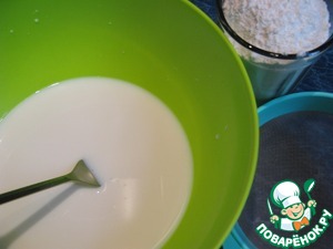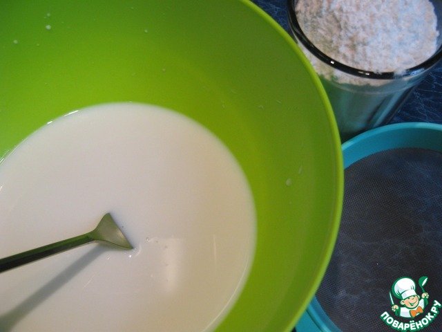 В теплом молоке растворить сахар, соль, дрожжи. Просеять 130 г муки.
