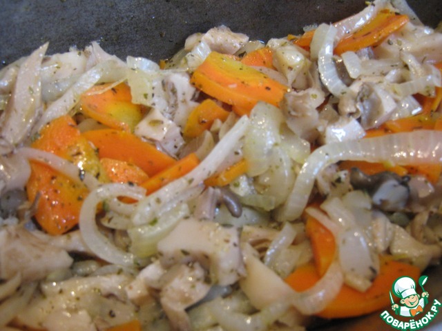 Добавить вешенки (солёные) и обжарить вместе с луком и морковью.