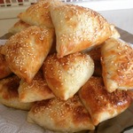 Выложить швами вниз на противень, застеленный пергаментом. Смазать взбитым яйцом, посыпать кунжутом.