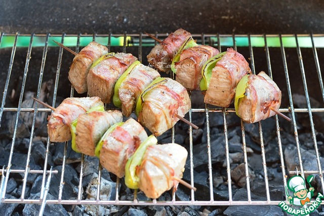Каждый кусочек говядины обернуть беконом и нанизать на шпажки, я прочередовала мясо с болгарским перцем, можно взять и другие овощи - лук, помидоры, кабачок, баклажан... в общем по желанию;