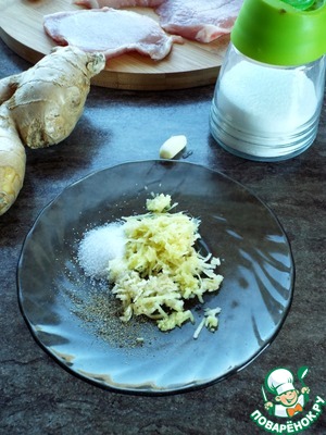 В блюдце смешать соль, чеснок, имбирь и перец.