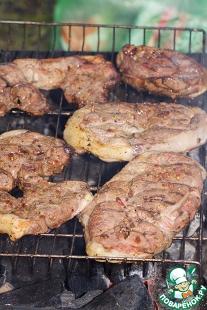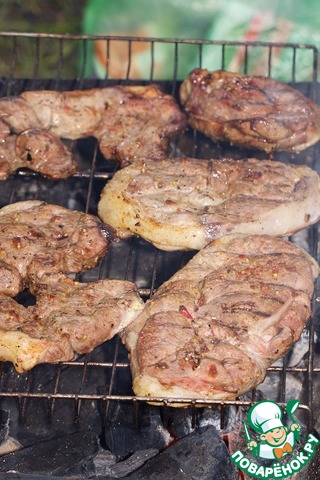 Обжарить мясо практически до готовности с двух сторон на хорошо разогретых углях, выложить в горячее блюдо, накрыть фольгой на 5 минут, подавать немедленно! На гарнир прекрасно подойдут горячие овощи-гриль, маринованный красный лук, разогретый на решетке горячий толстый лаваш.