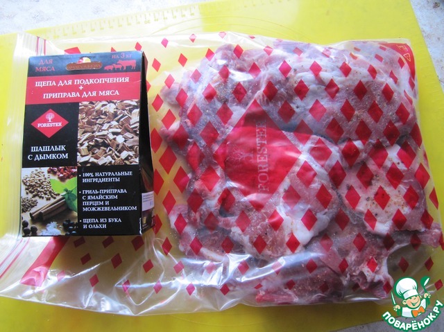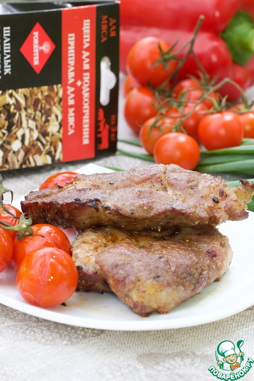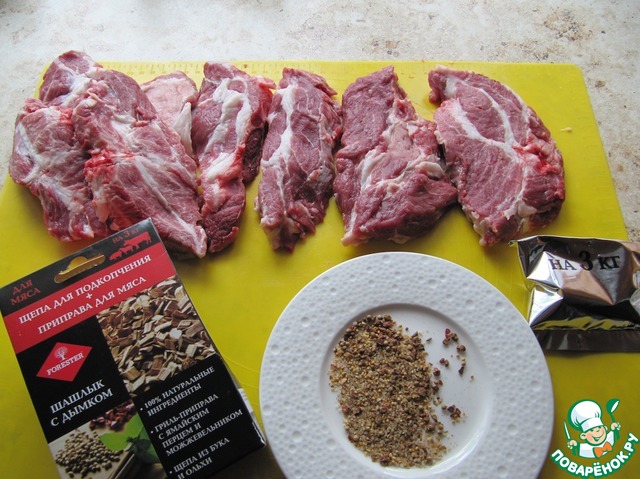 Для приготовления сочного стейка понадобится свежая шейная часть с небольшим содержанием жира и комплект для шашлыка с дымком от Форестер, содержащий гриль-приправы и щепу из бука и ольхи.