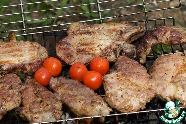 Разожгите угли в мангале – они должны подернуться белым пеплом, не должно быть открытых языков пламени! Когда жар достаточно хорош, выкладывайте мясо на решетку и готовьте практически до готовности, периодически переворачивая решетку!