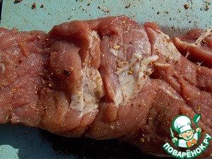 Засыпаем вырезку гриль-приправой от "Forester" так чтобы специи и соль попали в каждый разрез с обеих сторон. Соединяем разрезы между собой в единый кусок, смазываем соевым соусом и оставляем мариноваться на 4-5 часов. Лучше на ночь.