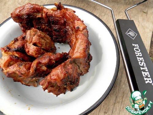 Приготовить на решетке от "Forester" на мангале до готовности, переворачивая и поливая мясо пивом.