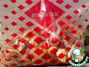 Сложить их в пакет для маринования из набора от "Forester". Всыпать остатки специй, перемешать, добавить масло и еще раз перемешать. Мариновать примерно 3-4 часа.