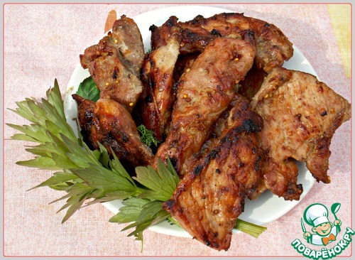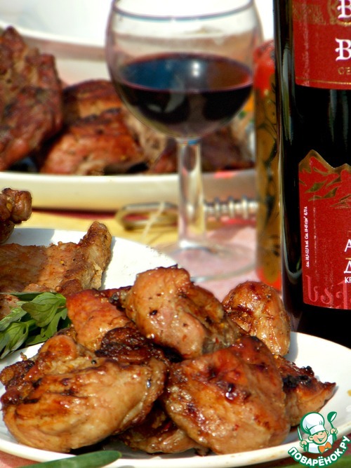 Нарезать свинину поперек волокон на кусочки величиной с ладонь толщиной 1.5 см. Немного посыпать приправой.