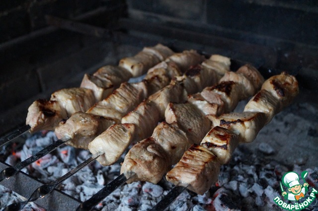 Жарим на углях, поворачивая шампуры несколько раз, до румяной корочки и готовности.
