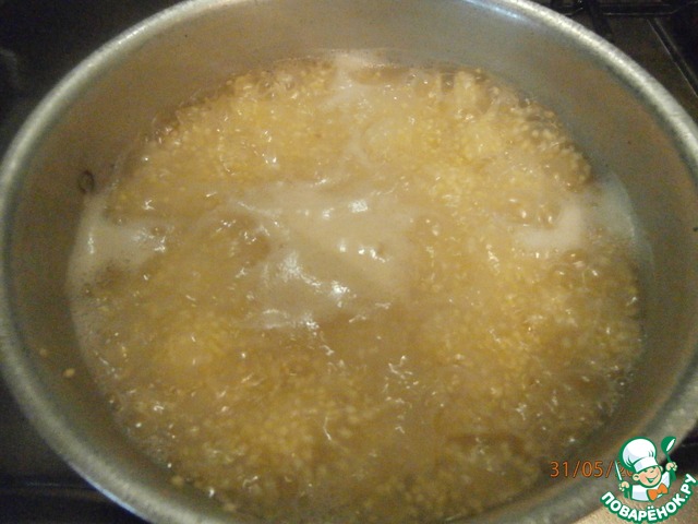 Всё довольно просто. В антипригарную кастрюлю налить воду, поставить на огонь, дать закипеть. Тем временем промыть пшено.