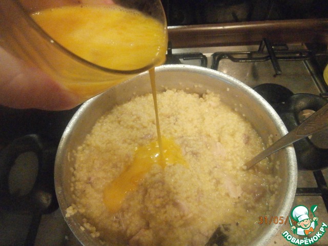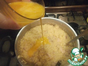 Тонкой струйкой, помешивая, вливаем яйца в кулеш. Очень тщательно перемешиваем.