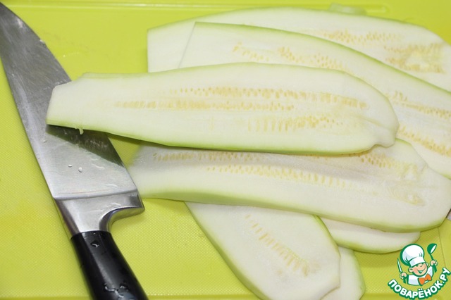 Баклажан порезать слайсами, присолить и оставить на 20 минут для удаления горечи. Затем соль смыть, ломтики обсушить.