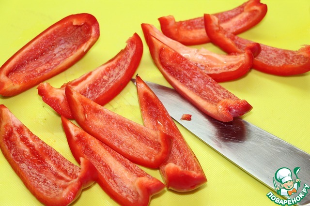 Болгарский перец освободить от семян и белых перепонок, порезать сегментами.