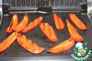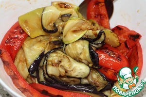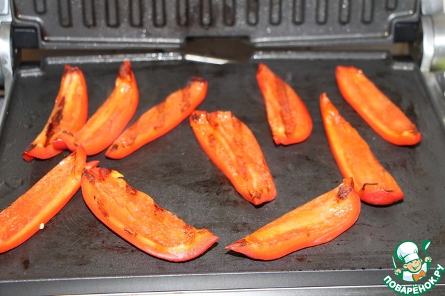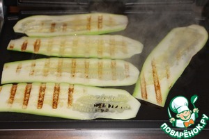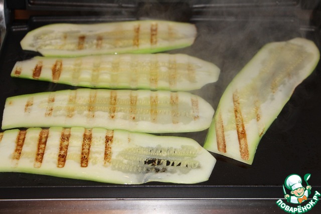 Овощи можно запечь в духовке, пожарить на сковороде. Я воспользовалась грилем лишь потому, что разогревать духовку жарко, на сковороде понадобится много масла. Кабачки слегка сбрызнуть растительным маслом.