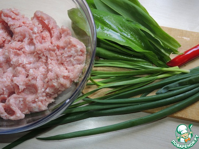 В заранее подготовленный мясной фарш добавить: мелко порезанный зеленый лук, зеленый чеснок, черемшу, красный перец чили, посолить и поперчить по вкусу и хорошо перемешать руками.