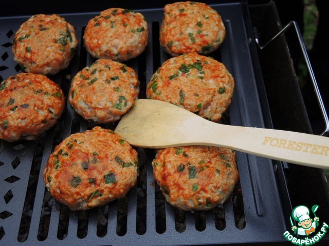 Заранее разжечь дрова в мангале, угли должны подёрнуться белым пеплом. Решетку или противень-гриль слегка смазать тряпочкой, смоченной в растительном масле и обжаривать котлеты с обеих сторон, переворачивая их. Как только они немного подрумянятся, силиконовой кистью слегка смазывать их соусом-барбекю и жарить до полной готовности.