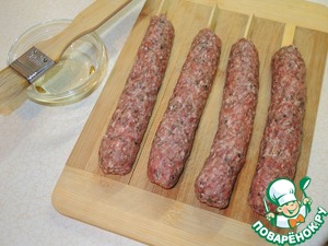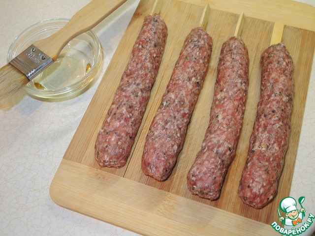 Из фарша сформировать 4-6 колбасок (зависит от длины палочек), нанизав их на палочки и убрать в холодильник на 20 минут. -