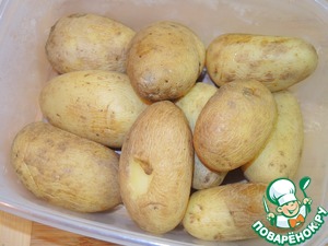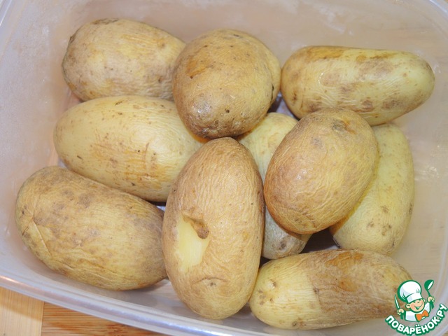 Молодой картофель заранее отварить в мундире и остудить. Перед обжаркой разрезать пополам вдоль.
