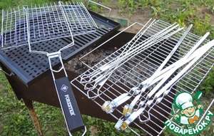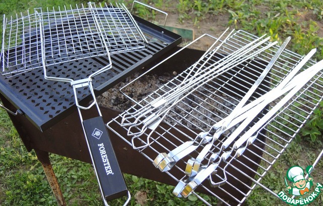 На раскалённые угли рассыпать заранее замоченную в воде щепу из бука и ольхи из набора для подкопчения мяса от Forester, это придаст блюду очень приятный аромат.