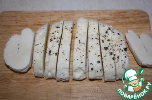 Халуми порезать на ломтики шириной 1 см.