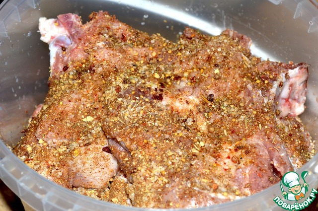 Для корейки я предпочла использовать набор для маринования мяса Forester "Шашлык с дымком". В набор входит приправа рассчитанная на три килограмма мяса и мешочек со щепой. Приправа уже содержит соль, поэтому дополнительно солить мясо уже не нужно.