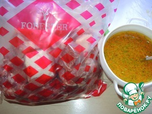 Мясо выложить в пакет для маринования от Forester, влить туда же маринад, пакет закрыть и маринад распределить равномерно по мясу. Оставить мясо или при комнатной температуре на 1 час или убрать в холодильник на 2-4 часа.