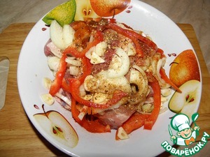 Лук нарезать полукольцами, перец полосками (если будете брать именно такое кол-во ребер, лучше их разделить на две посуды для маринада).