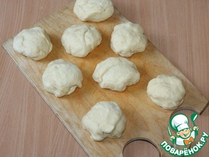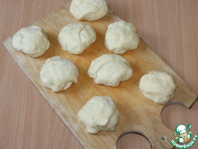 Присыпать столешницу небольшим количеством муки и сформовать колобки, 8 штук. -