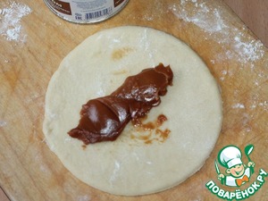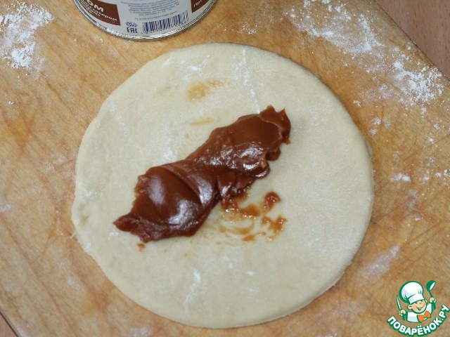 6. Смазать кружок топленым маслом и выложить начинку, вареную сгущенку.