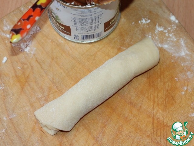 Я раскатала тесто, вырезала 4 круга и приготовила рогалики, заполнила середину пирога. -