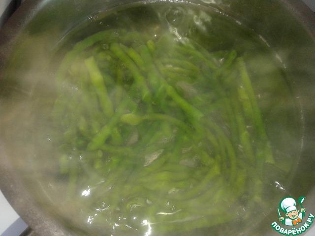Отварить чесночные стрелки в подсоленной кипящей воде до готовности, у меня стрелки варятся около 7-8 минут.