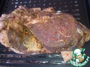 Натираем баранину специями. Мне нравится использовать специи (приправа "FORESTER" для мяса с можжевеловой ягодой и ямайским перцем).