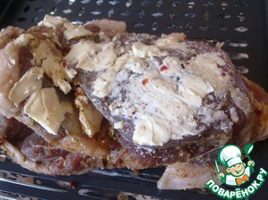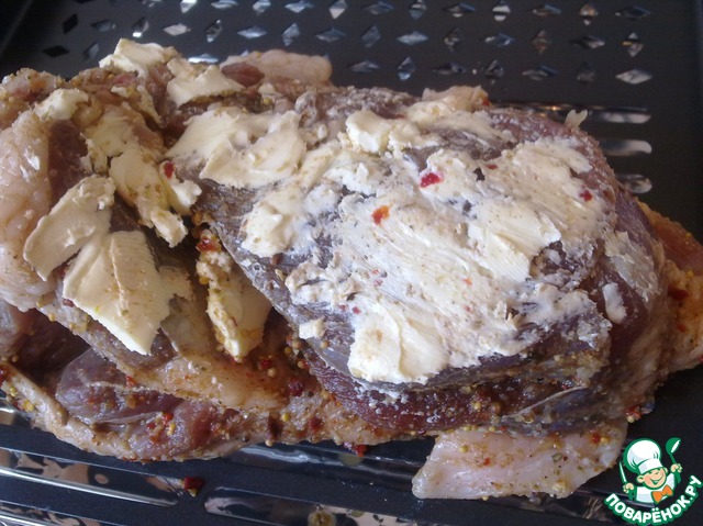Далее баранину необходимо сверху хорошо смазать сливочным маслом (масло для этого используйте немного размягченное).