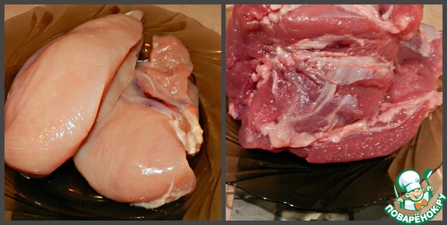 Берем примерно 0.5 кг. куриного филе и 1 кг. свиного мяса (лопатку или окорок), с не большим количеством жира.