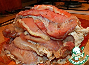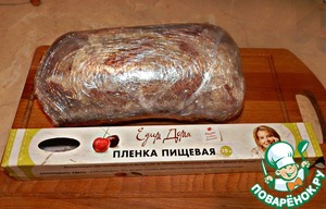 Через 2-4 часа достаем мясо, расстилаем на разделочной доске термостойкую пищевую пленку, которая выдерживает температуру 120 градусов.