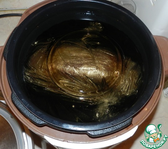 Укладываем наш сверток в мультиварку, заливаем водой, так, что бы мясо оказалось полностью покрыто водой, если всплывает - положите на него тарелку.