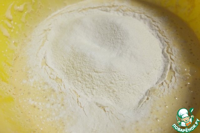Ввести в два приема в взбитые желтки. Перемешать миксером на небольшой скорости. Получится довольно плотное тесто. -