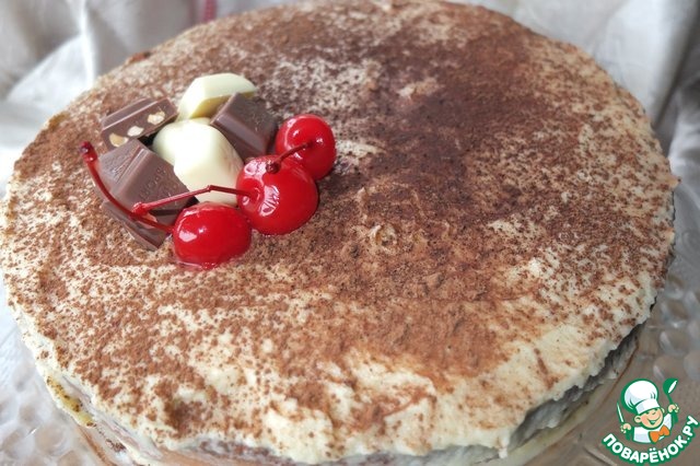 Когда бисквит остыл, смазала верх и бока кремом, посыпала какао-порошком и украсила вишенками и шоколадом.