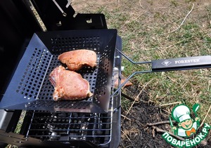 • Куски мяса кладём не плотно друг к другу, чтобы они хорошо прожаривались.