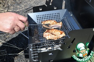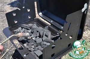 • В мангал, у меня тоже FORESTER, кладём угли, поджигаем, даём им прогореть.