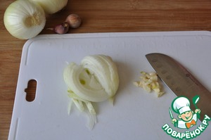 • Тонкими полукольцами режем лук, мелко рубим чеснок.