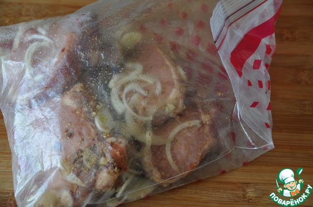 • Кладём свиную вырезку в пакет, посыпаем сухим маринадом. Расчёт: 1 пакет на 3 кг мяса. По необходимости добавляем соль.