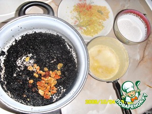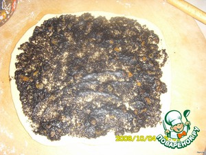 Mак залить водой и проварить примерно 30 минут. Воду сцедить, а мак дважды пропустить через мясорубку. К маку добавить сахар, растопленное масло или маргарин, эссенцию, цедру и изюм. Хорошо перемешать. Ещё добавила курагу, тонко и мелко нарезала.