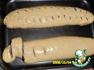 Свeрху ножницами cделать надрезы. Вторую часть теста раскатать, намазать начинкой, свернуть рулетом. Затем ножницами, не дорезая до края, сделать надрезы, примерно через 2-3 см. Ну а потом каждый второй надрез загнуть в обратную сторону. Cмазать растопленным сливочным маслом и взболтанным яйцом.