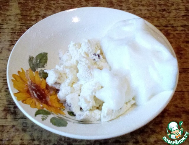 Для неё я использовала творожок, который продается в брикетах. Он у меня уже был с изюмом, поэтому изюм я не стала добавлять (хотя потом очень пожалела! На фото, где виден брикет, попробуйте найти изюминки )))