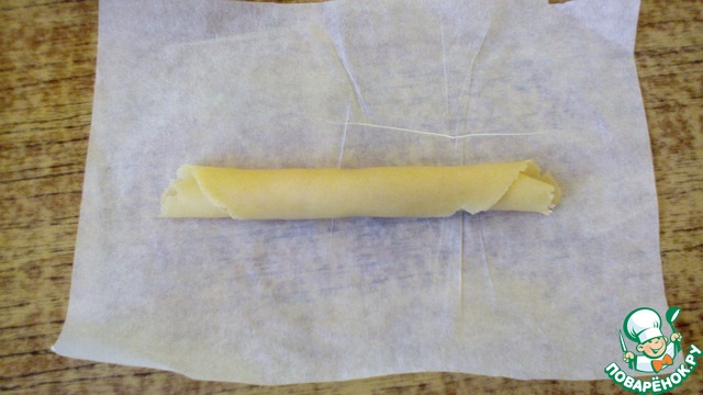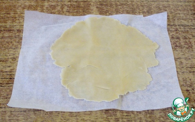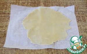 Каждый шарик раскатать как можно тоньше (лучше раскатывать на пергаменте, т. к. тесто жирноватое). Тесто будет тяжело раскатываться, придётся применить силушку богатырскую.))