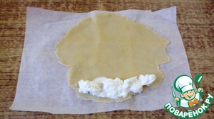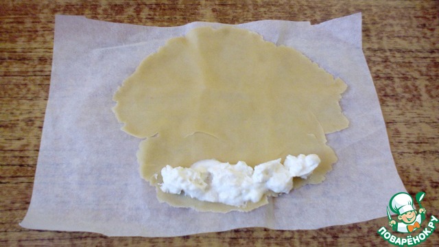 На край раскатанного круга выложить творожную начинку с изюмом (можно добавлять разные начинки, например, вишню, яблоки с корицей, чернослив.. всё на ваш вкус!))