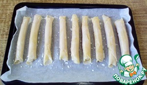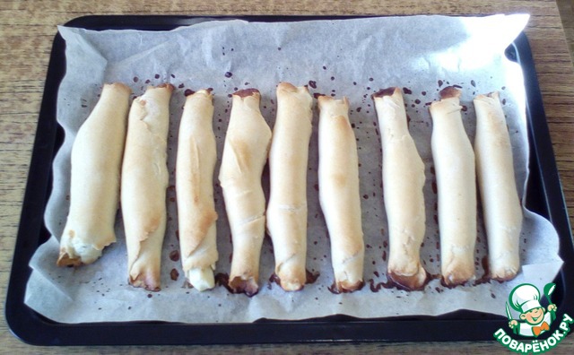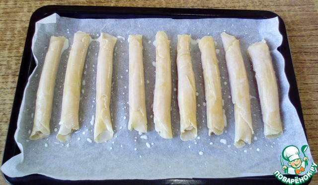 Готовые мини-штрудели получились размером 16 см в длину, 3 см в толщину и 3 см в высоту ))
