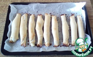 Все рулетики выложить на противень, застеленный пергаментом, и смазать их молоком.